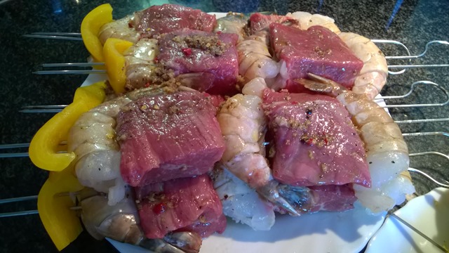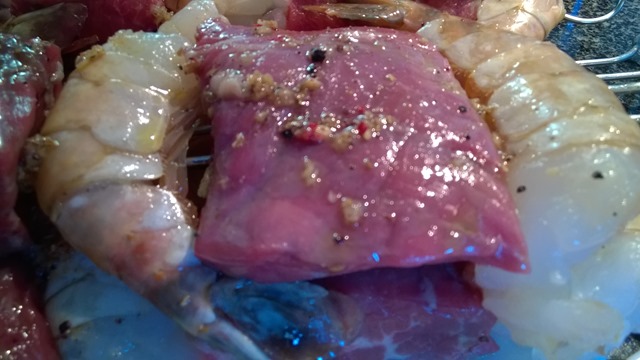 Als meine Frau sich mal wieder eine Kochzeitung gegönnt hatte, war ein toller Bericht für einen Fleisch / Garnelenspieß drin. “Kannst du uns auch mal machen, nicht immer nur Fleischbrocken”.