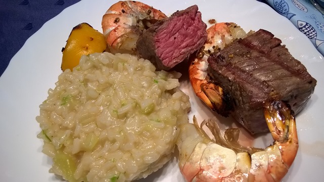 US Beef Flanke mit Garnelen vom Spieß an Fenchelrisotto