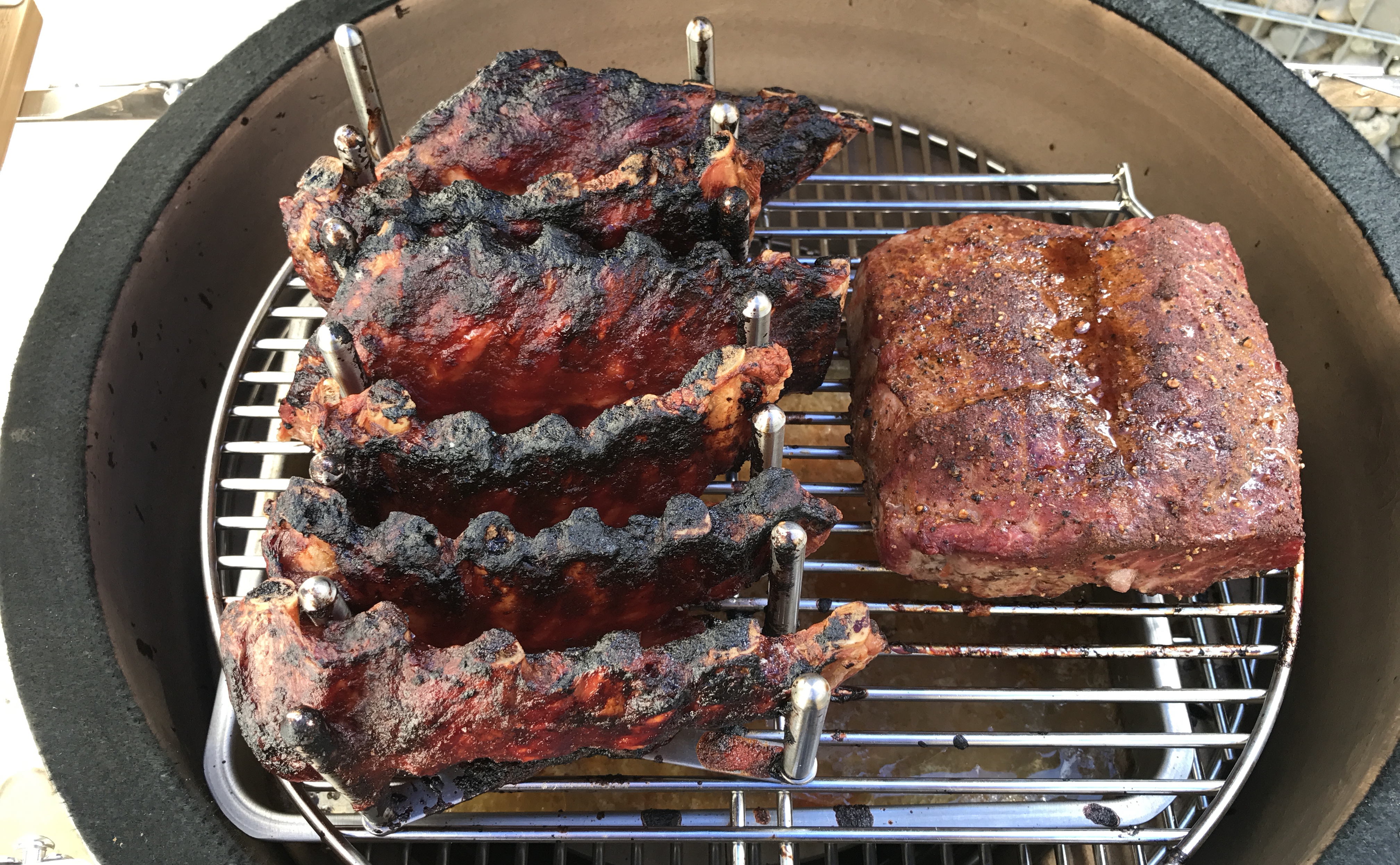 Ich habe auf den guten Deckelhalter vom Ikea ein paar leckere Rippen für 2,5h bei den 120°C ziehen lassen und dann die Temperatur durch regeln der Luftzufuhr auf 160°C erhöht. Ist erstaunlich wie schön das Ei die Temperatur gehalten hat.
