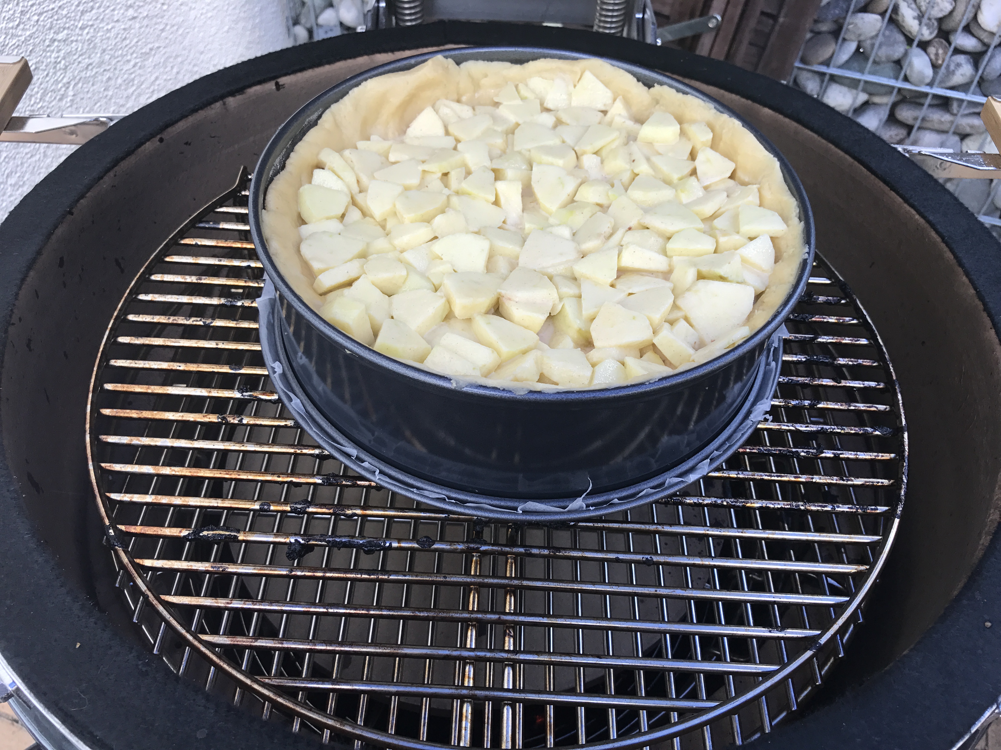 Und weil ich gerade in Ausprobierlaune war, haben wir mit der letzten Kraft die Temperatur auf 180° C nach oben geschafft (hätte etwas mehr Kohle in den Korb werfen sollen) um noch einen Apfelwein – Apfelkuchen zu backen 🙂