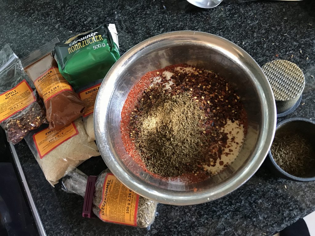 Für den Rub, die Gewürze aus der Tabelle vermischen und in ein größeres Glas füllen.