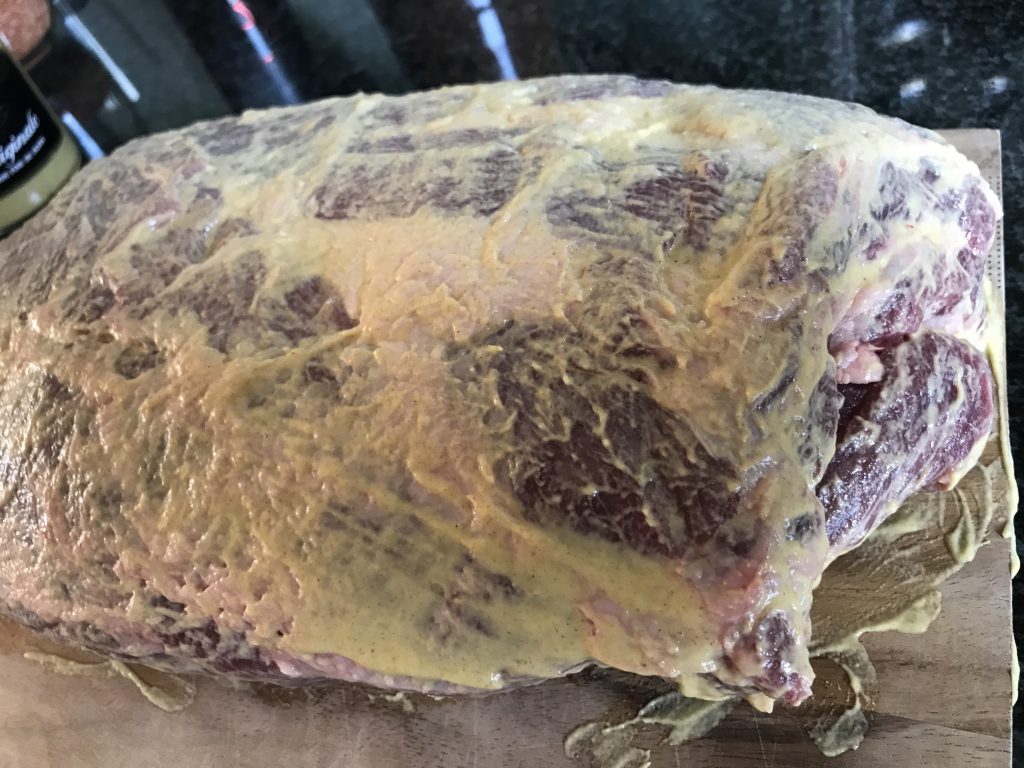 Das Pork mit dem Senf einreiben und dann den gemischten Rub großzügig auf