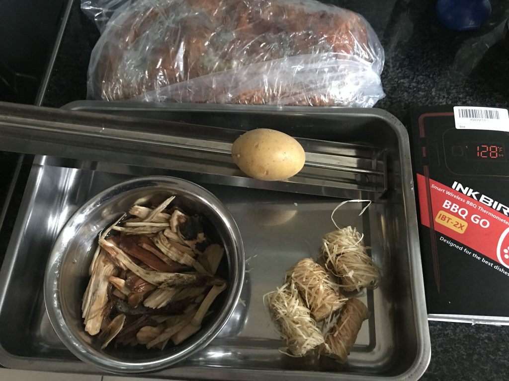 in Fleisch in Kartoffel packen und ab damit ins Ei :-). Deckel zu und Holz für das Smoken