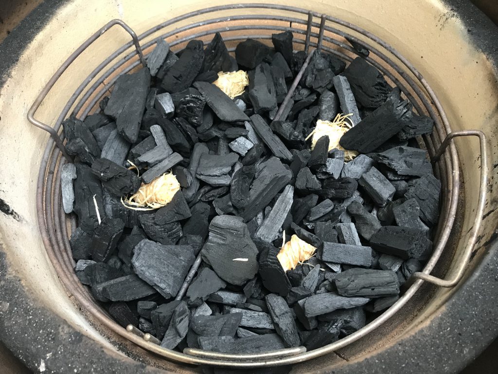 So, Kohlekorb ausgeleert und neu mit einfacher Buchenholzkohle gefüllt und mit Anzünd-