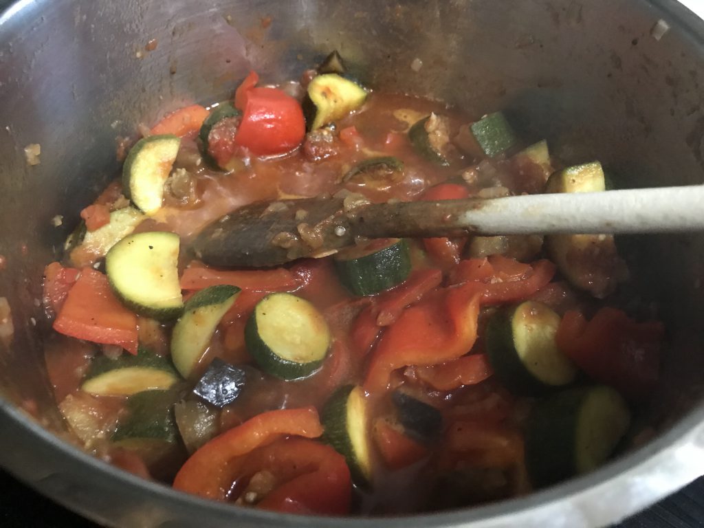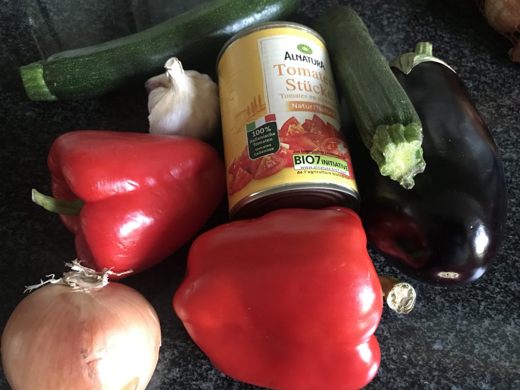 Wichtig, die Ratatouille muss als erstes angegangen werden, denn die braucht etwas Zeit damit diese auch Geschmack bekommt. Ich würde die leckere Gemüsemischung sicher eher eine Stunde ziehen lassen. Nehmt euch die Zeit, es ist es Wert.