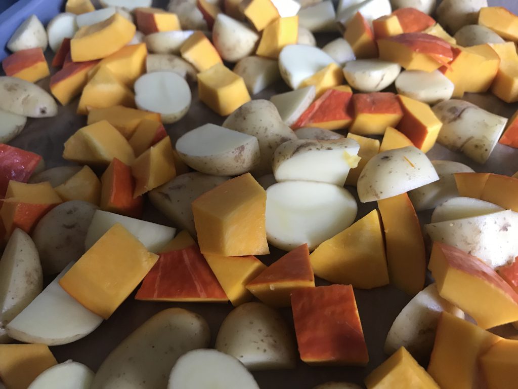 Parallel hat meine nette Frau sich mal wieder – wie so oft – um die Beilagen gekümmert. Heute gibt es Kartoffeln und Kürbis vom Blech – einfach lecker !