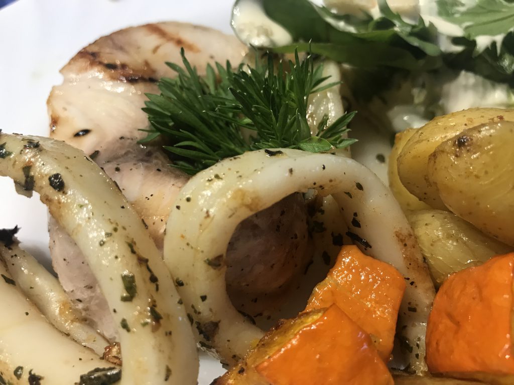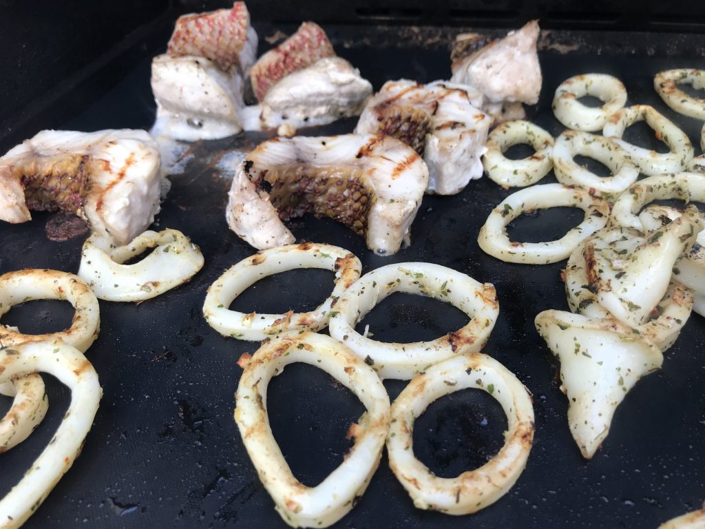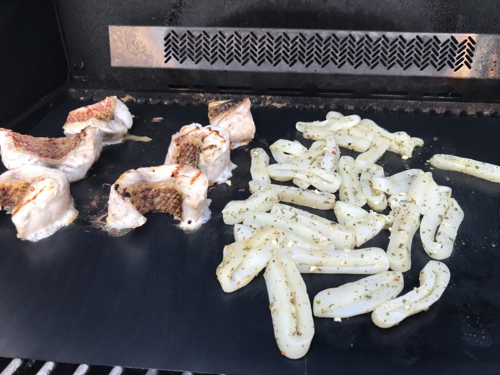 Was haben wir gemacht. Red Snapper vom Grill mit frischen Tintenfisch Tuben – lecker, aber klebt schnell an. Bisher immer auf der Plancha gemacht, aber ihr kennt das, ist zum reinigen auch ein Thema.