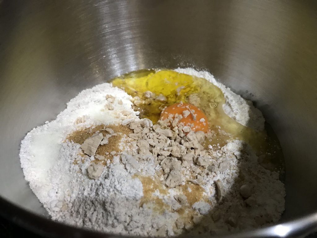 Meine Frau und ich sind was Hefeteig angeht recht einfach gestrickt. Nix chichi, eher einfach gut. Also, die beiden Sorten Mehl in eine große Schüssel geben und die 1/2 Hefe auf den Teig zerbröseln. Ein Ei, etwas braunen Zucker, eine Prise Salz und 6 EL Olivenöl hinzugeben. Das Wasser- / Milchgemisch zugeben und in die Küchenmaschine klemmen.