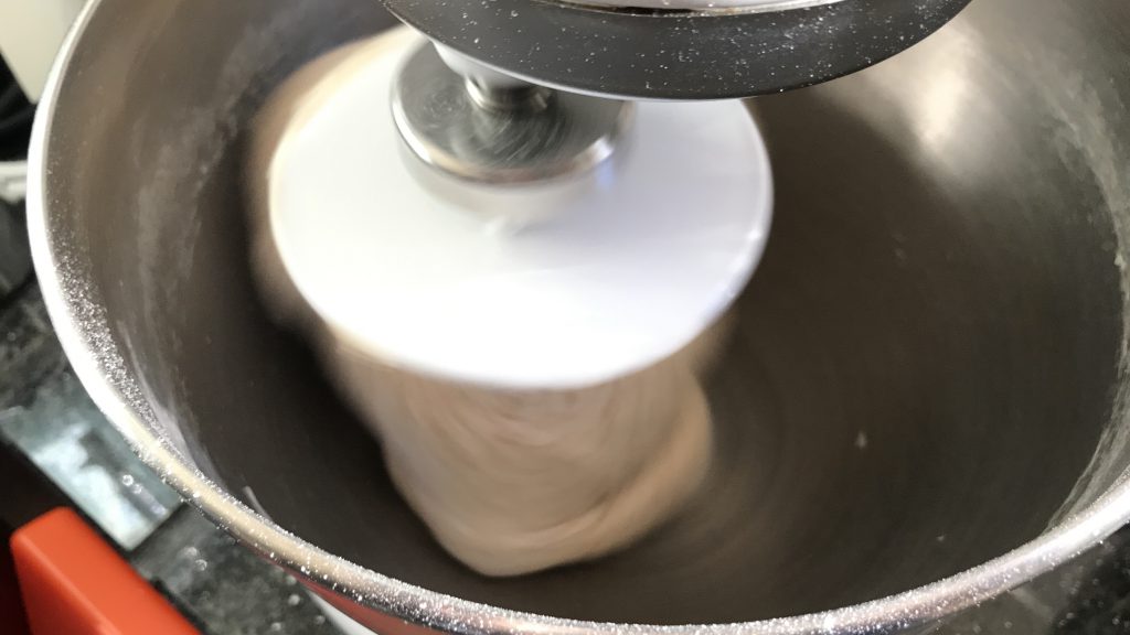 Jetzt den Teig mit dem Knethaken ca. 7-8 Minuten durchkneten lassen. Die Küchenmaschine nicht aus den Augen lassen, sonst liegt die bei so einem Brocken Teig schnell in der Küche :-):