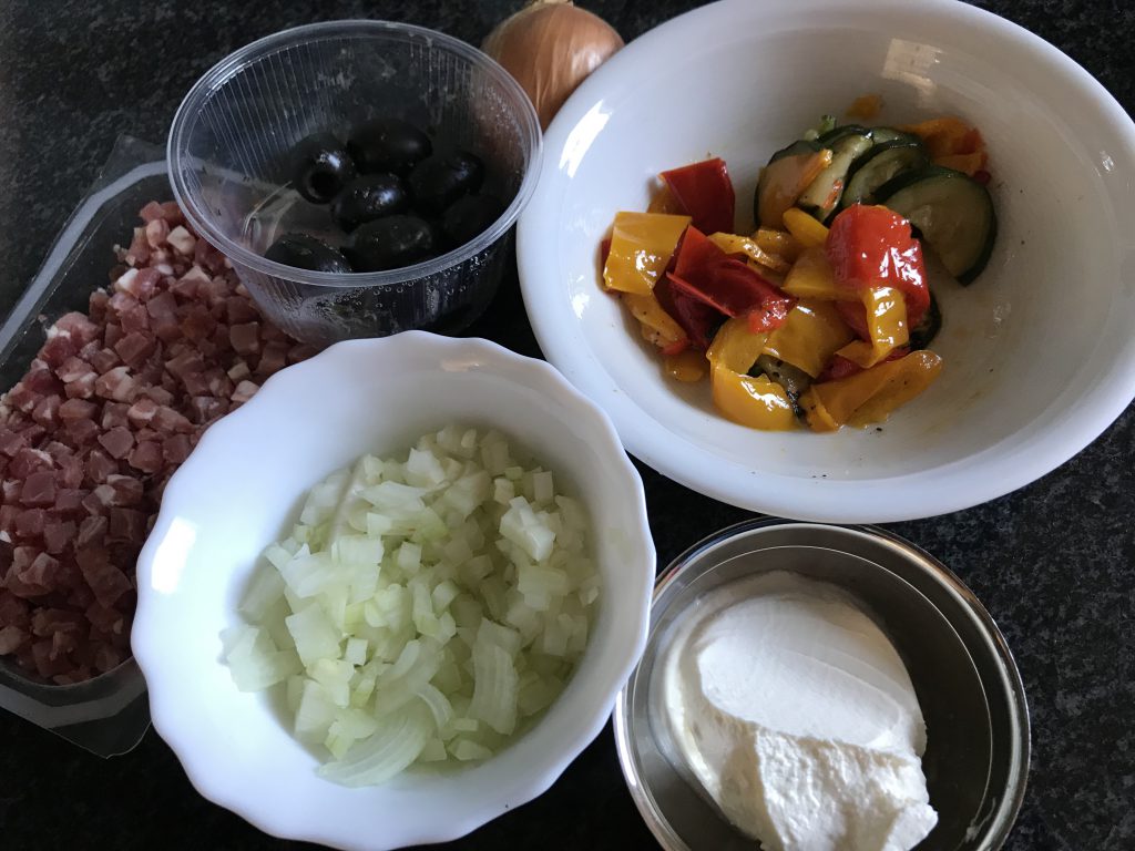 So für den Belag könnt ihr Speck und Chorizowurst nehmen, oder und das ist auch super lecker einfach Paprika, Zucchini und alles auf was ihr Lust habt, vorbereiten. Wir haben auch noch Pepperoni und Fetakäse gehabt – unglaublich lecker 🙂