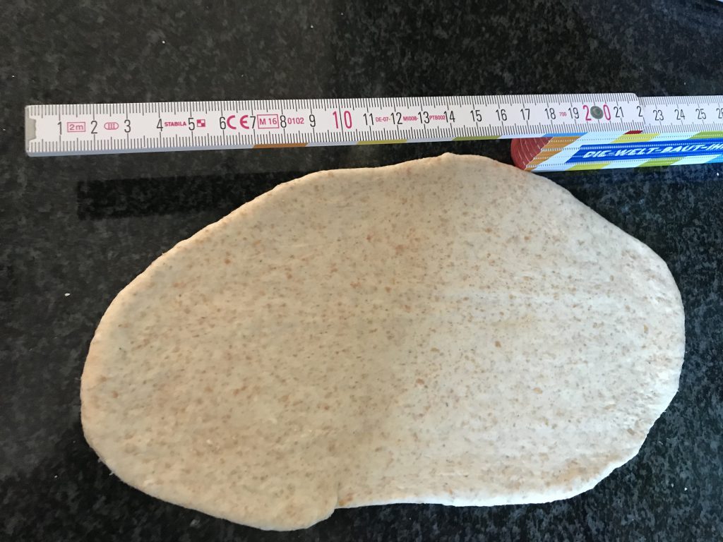 Den fertigen Teig nochmals richtig von Hand durchkneten. Ggf. müsst ihr noch einn wenig Mehl dran machen damit er nicht klebt. Danach ca. 90g