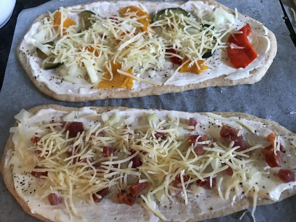 Die Dinnele auf Backpapier legen und mit etwas Schmand versorgen. Pfeffer aus der Mühle drauf und dann Belag nach Bedarf. Der Fantasie sind keine Grenzen gesetzt und alles ist erlaubt – o.k., Fleischwurst passt nicht wirklich 🙂