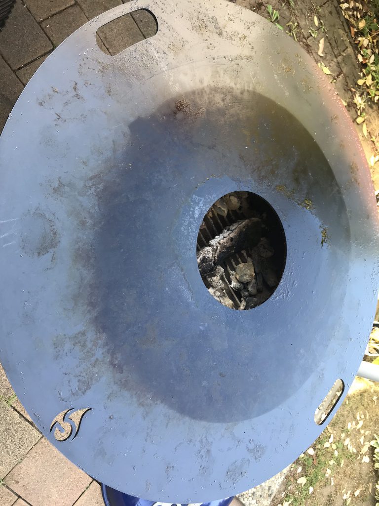 Wenn der Grill Schwung hat, die Platte mit der OBERSEITE !!! nach unten auf den Grill legen. Kleiner Tipp, der Buchstabe muss spiegelverkehrt sein. Das ist deshalb wichtig, weil die Platte sich wölben wird und da muss dann so sein, das bei richtiger Nutzung das Öl/Fett usw. nach innen laufen kann.