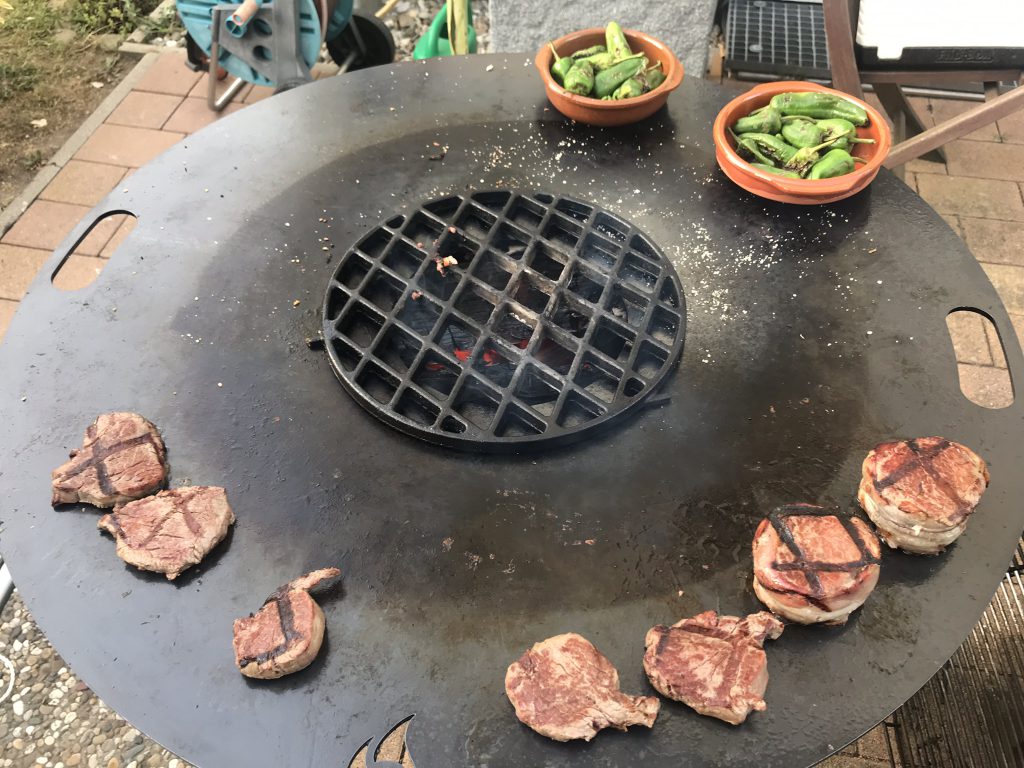 Ich hatte euch ja bei den Fetapäckchen schon von diesem Grillfest erzählt. Da hatten die Buben statt mit einem Grill, die Leckereien auf einem Fass mit einer Feuerplatte zubereitet. Was soll ich euch sagen, das mit dem Fass haben ich wegen eines gewissen Platzmangel nicht geschafft, aber so eine Feuerplatte aus massivem Stahl – die kann ich locker noch verkraften 🙂