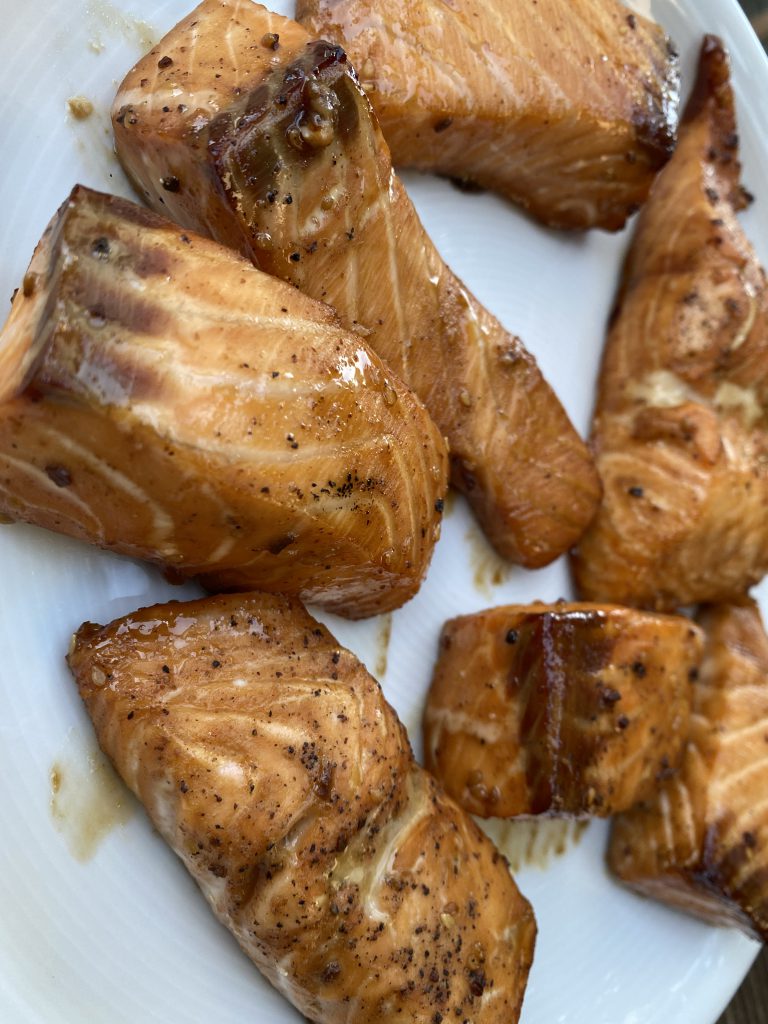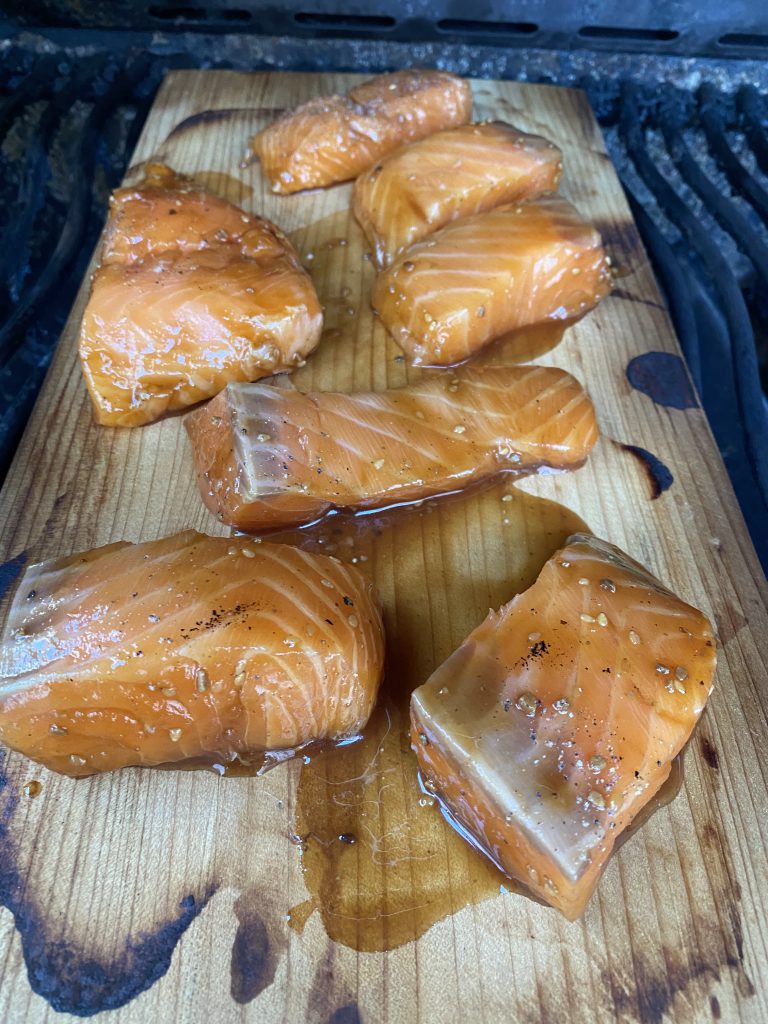 Das Zedernholz in die direkte Hitze auf dem Grill legen bis es anfängt zu knacken. Dann schiebe ich das Brett in die indirekte Hitze und legen den Lachs drauf. Ich lassen den Lachs dann so zwischen 3 und 4 Minuten pro Seite drauf, kommt aber auf euren Geschmack und die Dicke der Stücke an.