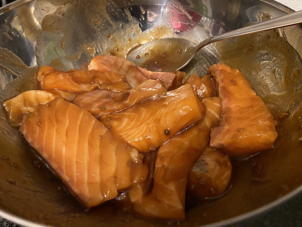 Den Bio Lachs abzupfen und säubern, wenn nötig. Eine euerer Lieblingsschüsseln nehmen und den Lachs in ca. 2-3 EL der Teriyaki Soße marinieren. Schüssel zur Seite stellen, brauchen wir erst später 🙂