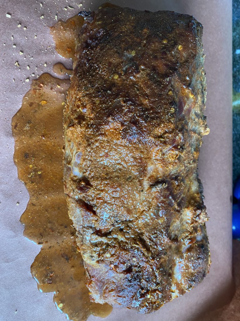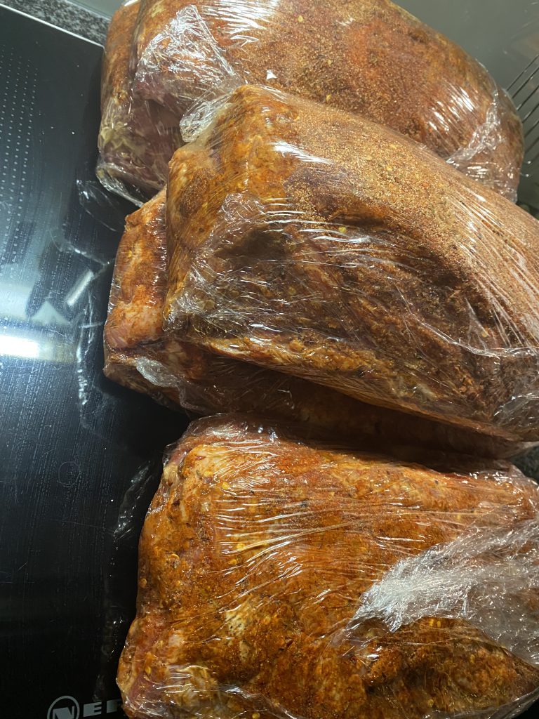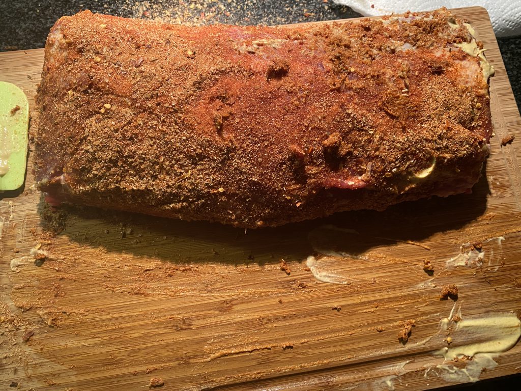 Das Schwein mit Dijon Senf einreiben und den Rub großzügig drauf verteilen. Dann alles in Frischhaltefolie einwickeln und über Nacht in den Kühlschrank legen.