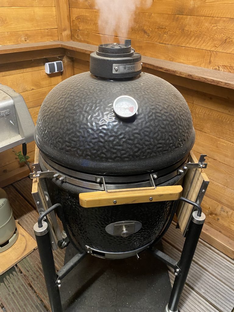 Anfeuern des Monolith Keramik Ei’s und der Weber Kugel mit Mignon Ring. Ziel sind ca. 120°C Innentemperatur.
