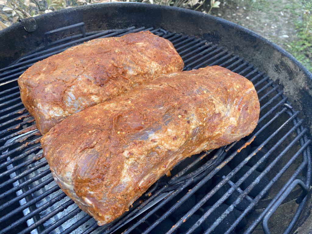 Wenn der Grill seine 120°C getroffen wird, wird es Zeit das Fleisch auf den Grill zu packen. Ich habe wie immer im Grill eine Schale mit Wasser wegen der gleichmäßigen Temperatur eingelegt und den Zwischenboden eingelegt, damit etwas Abstand zur Kohle / Hitze ist.