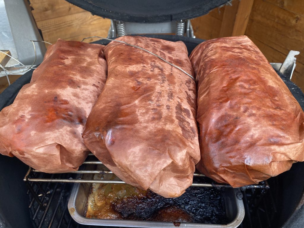 Jetzt wird es spannend, Texas Time – nie vorher gemacht, aber ohne Risiko keine Ergebnisse 🙂 Das Fleisch vom Grill nehmen und jeweils ein großes Stück vom Butcher Paper nutzen und das Fleisch drauflegen. Jetzt von dem Mop auf das Fleisch geben und das Butcher Paper zuklappen.